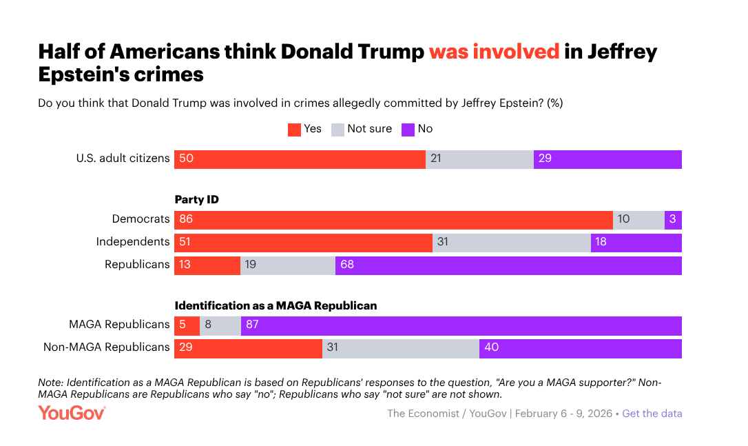 To some, that means impunity. That’s what Reuters found in its survey. Nearly 70 percent “said their views were captured ‘very well’ or ‘extremely well’ by a statement that the Epstein files ‘show that powerful people in the US are rarely held accountable for their actions.’”