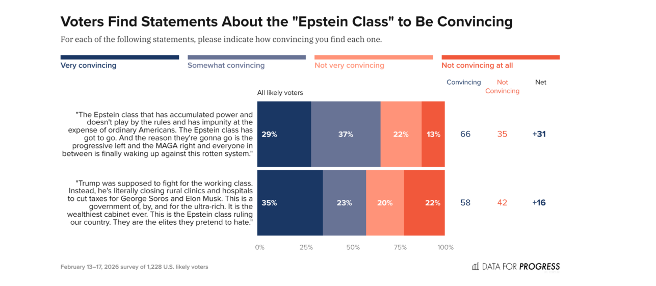 But to others, it just means rich. Data For Progress found that 74 percent identified all “wealthy elites” as “Epstein class.” Another 66 percent agreed with Jon Ossoff’s statement: “The Epstein class that has accumulated power and doesn't play by the rules and has impunity at the expense of ordinary Americans. The Epstein class has got to go.”