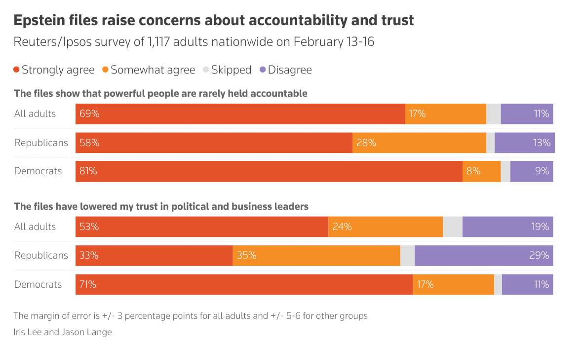 Some 69 percent of respondents in the four-day poll, which concluded on Monday, said their views were captured "very well" or "extremely well" by a statement that the Epstein files "show that powerful people in the U.S. are rarely held accountable for their actions."